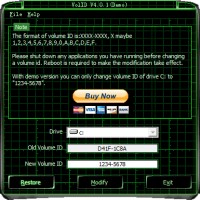 With VolID you can modify your disk drive's serial number which is also called volume ID (not hard disk's physical serial which you can find at back of your hard disk) , the format of volume ID is: XXXX-XXXX (X maybe 0,1,2,3,4,5,6,7,8,9,A,B,C,D,E,F).