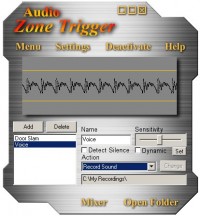 Audio Zone Trigger is a sound detection software. It takes live audio from any input source and enables the computer to react to it in a user-specified manner. The sound-detection system lets you set any number of Triggers that perform any number of user-defined responses (record sound, run a file, execute a hotkey, etc.). The triggers can also dynamicaly adap to the environment's sound volume to detect only sound peeks. You can set each trigger's sensitivity and actions individually, giving you full control.