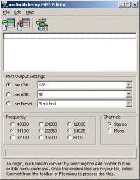 AudioAlchemy MP3 Edition is fast, easy-to-use, highly configurable, and affordable audio conversion software that provides complete control over quality, bitrate, frequency, channels, and much more. Convert from CD, WAV, MP3, WMA, OGG, AIFF, AU, FLAC, AAC, AC3, ADPCM, ALAC, MP4, M4A, WavPack, and more to MP3 in a snap. The software can also convert existing MP3 files to a different bitrate, frequency, and/or channel setting; for example, converting a 320 kbps MP3 to 128 kbps for use in a hardware device that requires a specific setting or does not support the higher bitrates.
