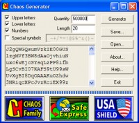 CHAOS Generator is an application designed to generate passwords of any length and character content. CHAOS Generator will create alphabetic, numeric, alphanumeric or all keyboard characters passwords of user-defined lengths. The passwords are displayed and can be copied to your clipboard.
