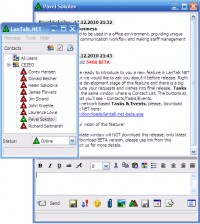 LanTalk NET office instant LAN messenger that work in LAN, WAN or Internet, without any server or internet access! Designed for business networks. In fact, in most companies LanTalk.NET replaced corporate e-mail for exchanging files and messages. For an additional fee you will get a custom version of LanTalk NET.
